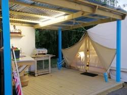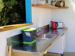The covered kitchen area has plenty of equipment for meal preparation: BBQ, fridge, toaster, electric jug, pots and pan, serving dishes, crockery and cutlery.