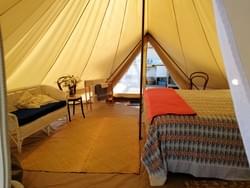 Camp in comfort. Enjoy the authentic sleeping-under-canvas experience but relish the luxury of an ultra comfortable super king bed with individually controlled electric blanket.