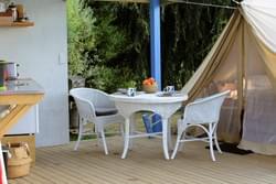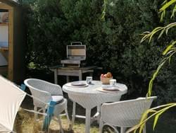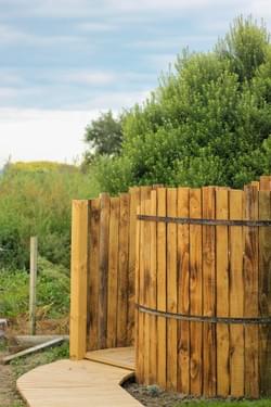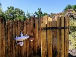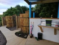 The outdoor shower and loo pods appear rustic but the water is gas-heated and the loo is a proper flushing affair (no long drops or malodorous composting bucket here.)